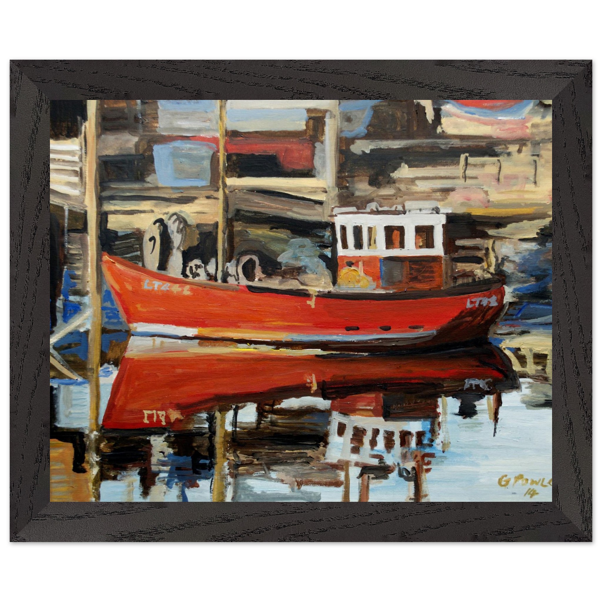 Rich, painterly brushstrokes and layered oil textures bring depth and warmth to the scene. The bold red of the boat creates a striking focal point, contrasting beautifully with the muted greens, blues, and earthy tones of the surrounding landscape. Subtle reflections ripple across the water’s surface, enhancing the sense of stillness and quiet movement that defines the composition.