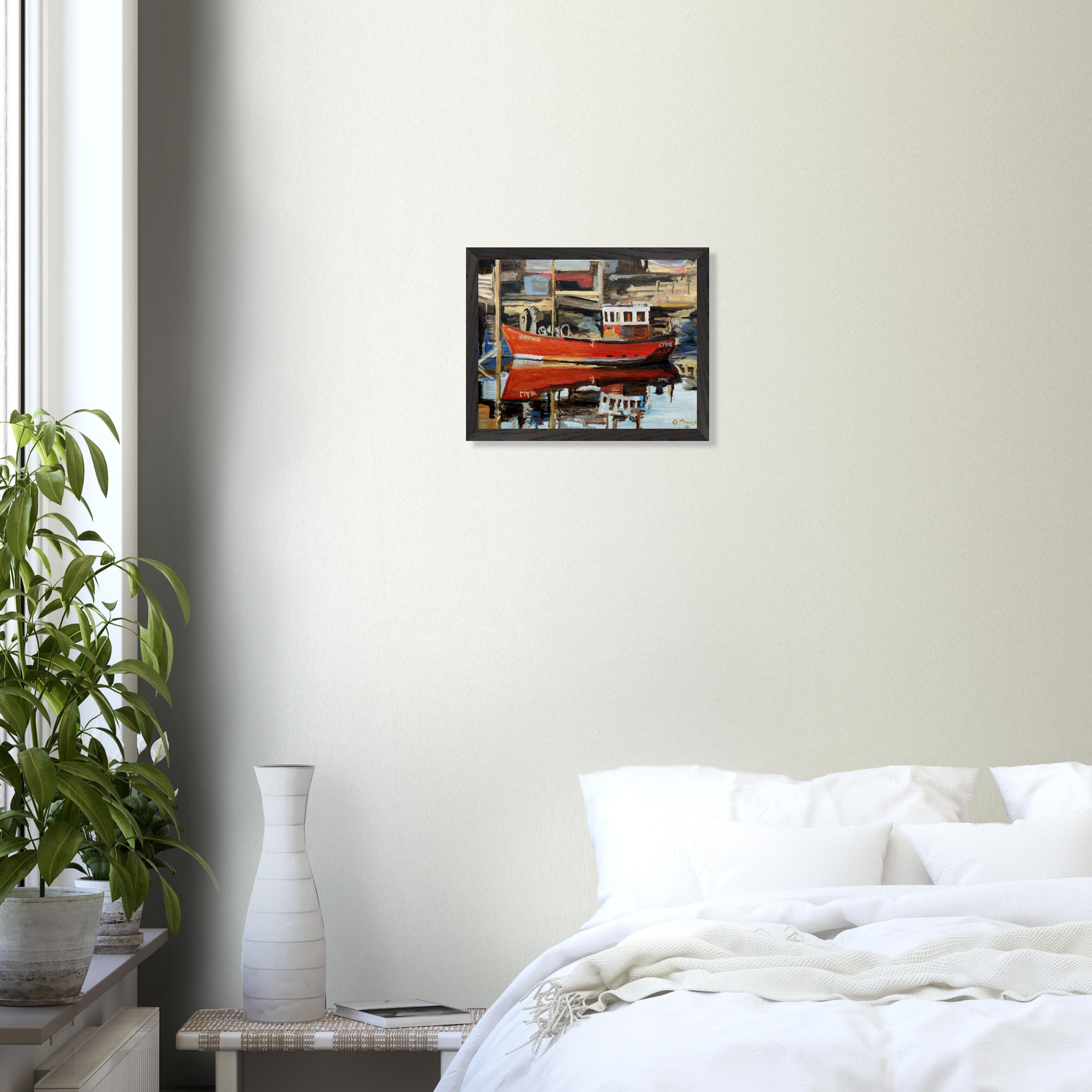 Add a touch of calm and character to your space with this oil painting of a red boat on a quiet river, beautifully presented as a premium wooden framed poster. The artwork captures a peaceful riverside moment, where a single red boat rests gently on still water, surrounded by soft reflections and a tranquil natural setting.